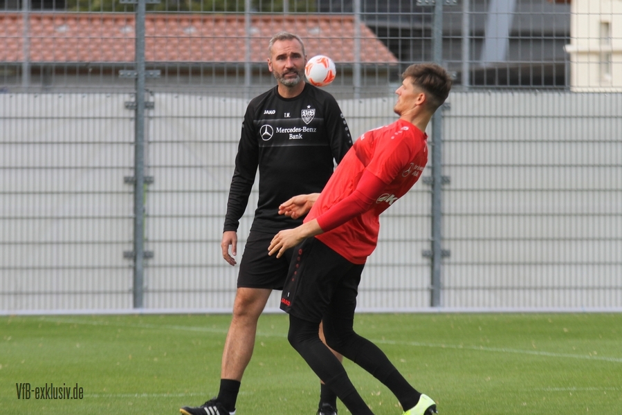 Doch mit Beginn der zweiten Einheit auf kleine Hockeytore brach der Stürmer die Einheit ab. Er deutete es dem Therpeuten Gerhard Wörn bereits an und später auch seinem Sportdirektor Sven Mislintat, dass er mit dem rechten Fuss umgeknickt war. Sein Trainingsabbruch schien allerdings eher eine Vorsichtsmaßnahme zu sein. Ob der Siegtorschütze von Bielefeld in den kommenden Einheiten wieder dabei ist, wird sich zeigen. Am Ende der Einheit erdrehten sich die Verlierer um Mario Gomez und Emiliano Insua ihre Strafrunde am Glücksrad wieder selbst. Die Spieler mussten per Rolle vorwärts über den Platz. Gregor Kobel und Fabian Bredlow trainierten unterdessen unter Anleitung von Torwarttrainer Uwe Gospodarek mit Handbällen, die auch zu Beginn der Einheit bei Trainer Tim Walter für eine Herausforderung beim Ballhochhalten dienten.