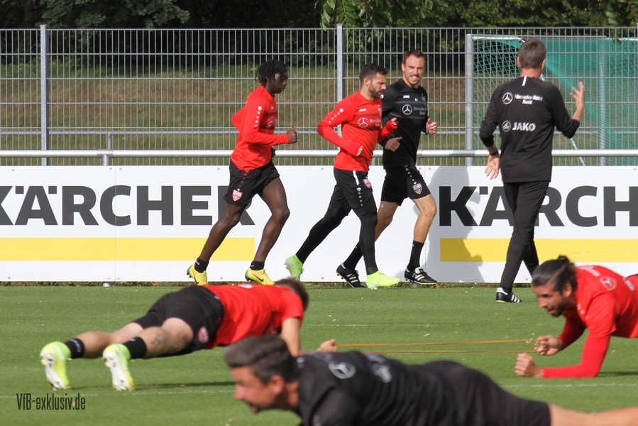 Schon im Spiel auf der Bielefelder Alm musste Trainer Tim Walter auf den ein oder anderen Akteur verzichten. So waren Castro, Wamangituka und Klement erst gar nicht im Kader, Nicolas Gonzalez blieb ohne Einsatz auf der Bank. Ein ähnliches Bild zeigte sich mit dem Start in die Trainingswoche. Jede Menge Spieler, darunter auch U19-Junior Jordan Meyer, waren im Mannschaftstraining und doch fehlte noch ein halbes Dutzend, die entweder nur liefen oder im Kraftraum waren. Philipp Klement und Silas Wamangituka liefen zusammen ihre Runden um die weitläufigen Plätze am Cannstatter Clubzentrum. Gonzalo Castro und Tanguy Coulibaly absolvierten eine individuelle Einheit mit Matthias Schiffers. Daniel Didavi war hinter verspiegelten Glasscheiben im Kraftraum zu erkennen und Nicolas Gonzalez konnte man nirgends erspähen. So bleibt die Sturmhoffnung erstmal an Klimowicz und den erfahrenen Spielern Gomez und Al Ghaddioui. Nach einer Aufwärmeinheit mit Bändern ging es aufs Halbfeld in die erste Spielform. Hamadi Al Ghaddioui lag dabei plötzlich am Boden. Nach einer kurzen Behandlung und Stresstest ging es für ihn weiter.