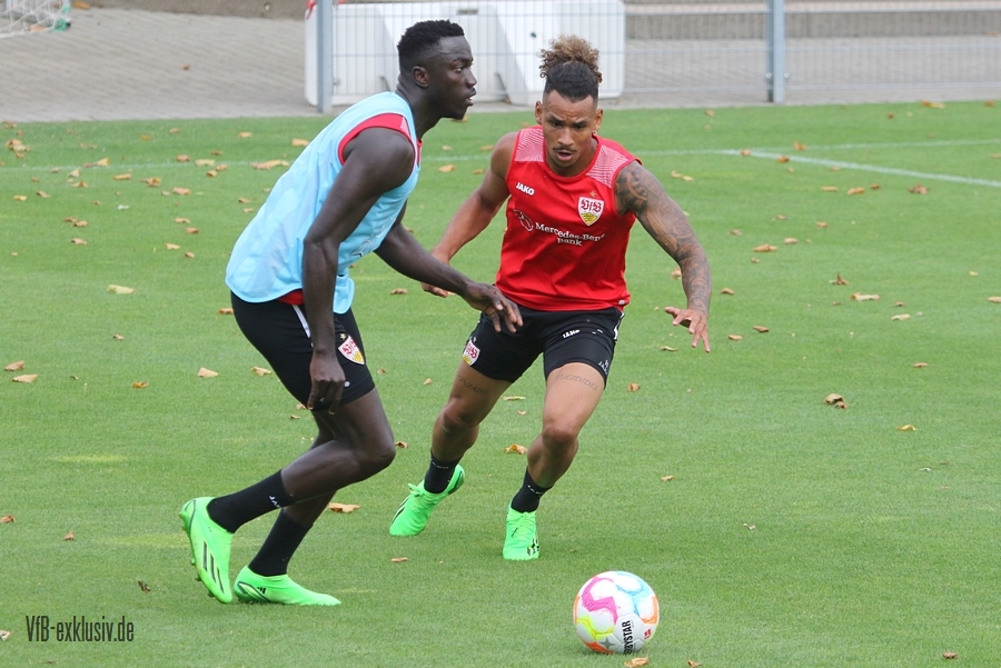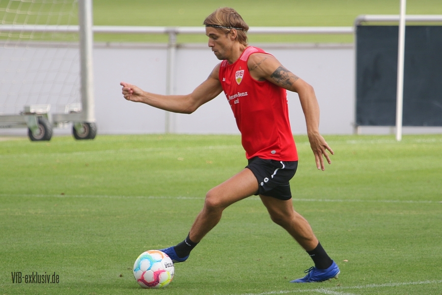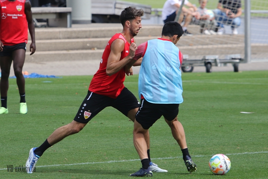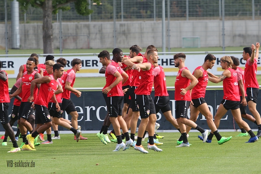 Zur Einstimmung auf das erste Heimspiel der neuen Saison, öffnete der VfB, sehr untypisch, die Tore zum Abschlusstraining. Mit dabei waren die mit Rückenproblemen noch ausstehenden Fragezeichen fürs Spiel, Pascal Stenzel und Darko Churlinov. Ebenfalls voll im Mannschaftstraining waren Atakan Karazor und Borna Sosa. Für diese beiden Spieler kommt das Spiel allerdings zu früh. Für Thomas Kastanaras ging es nach der Warmlaufrunde auf den Nebenplatz, er trainierte nach seiner Verletzung wieder individuell. Für den Rest des Teams ging es erst in eine Torabschluss-Übung aufs Halbfeld. Der Schütze musste den nächsten Schützen am Torschuss hintern. Bei dieser Einheit ging es Schlag auf Schlag. Nach zwei Runden wurde das Spielfeld größer und es ging in die Spielform. Wer von den Zuschauern nun dachte, die Startelf für Sonntag präsentiert zu bekommen, lag nur teilsweise richtig. Für die Abwehr konnte man erkennen, dass wohl Ito, Anton, Mavropanos und Vagnoman starten werden. Doch das sollte auch nicht die ganz große Überraschung darstellen. Mit Endo ist auch der Kapitän gesetzt. Die halbe Mannschaft steht also, doch ob Ahamada oder Millot neben Endo in der Startelf steht, ließ sich nicht erahnen, beide spielen einmal in der Stammelf. Im ersten Part der Spielform waren Silas, Führich, Tomas und Kalajdzic mit den blauen Leibchen unterwegs, im zweiten Teil tauschen Churlinov und Kalajdzic, ehe Kalajdzic das Leibchen wieder von Tomas bekam. Ein munteres Wechselspiel im Angriff. Nachdem der Österreicher allerdings nach einem Zweikampf kurz am Boden blieb, dann zur Vorsicht das Training abbrach, hatte am Ende auch Neuzugang Luca Pfeiffer noch die Gelegenheit sich in der Startelf zu zeigen. Für Juan Perea bleibt zumindest nach den Eindrücken aus dem Abschlusstraining vorerst nur die Bank. Sollte der Coach seine Elf noch nicht final im Kopf haben, wird er wohl noch eine kurze Nacht erleben. Egal wer es am Ende auf dem Rasen stehen wird. Die Startelf wird gut besetzt sein und von der Bank ist ebenfalls noch viel Offensivkraft zu erwarten.