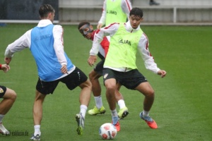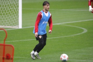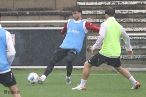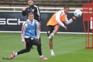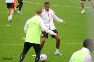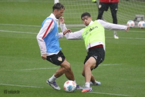 Die Länderspielpause biegt auf die Zielgerade, zumindest die deutschen A-Nationalspieler sind wieder zurück im VfB-Training. Finn Jeltsch, Chema, Lazar Jovanovic und Ermedin Demirovic sind noch für ihre Farben im Einsatz, Bilal El Khannouss war am Montag mit Marokko in Sambia am Ball und ist noch nicht zurück. Tiago Tomas war nicht auf dem Rasen, Daxo Zagadou trainierte individuell. Bei den Keepern fehlte Fabian Bredlow, er war auch im Test gegen Großaspach nicht im Einsatz. Vom NLZ waren Efe Korkut, Mirza Catovic, Mo Sankoh, Lauri Penna und Chris Olivier mit dabei. Im strömenden Regen standen noch einmal hunderte Fans auf der Tribüne im Schlienz, bevor in der kommenden Woche die Schule wieder beginnt. Nachdem Sebastian Hoeneß im letzten Spiel mit Finn Jeltsch und Ramon Hendriks noch zwei Innenverteidiger zur Verfügung standen, als Back-up saß Daxo Zagadou auf der Bank, waren mit Jeff Chabot und Luca Jaquez wieder zwei Profis voll im Training. Für den Coach entspannt sich die Lage also in der Abwehr wieder. Luca Jaquez trainierte nach seinem Nasenbeinbruch mit Maske. Auch Leonidas Stergiou konnte, nachdem er über die letzten Wochen langsam ans Mannschaftstraining herangeführt wurde, wieder das komplette Programm absolvieren.