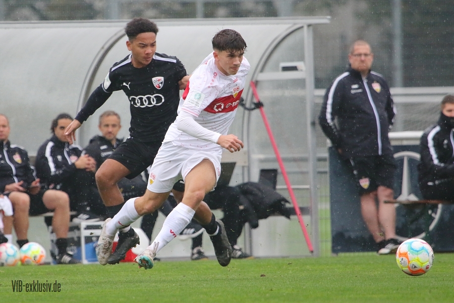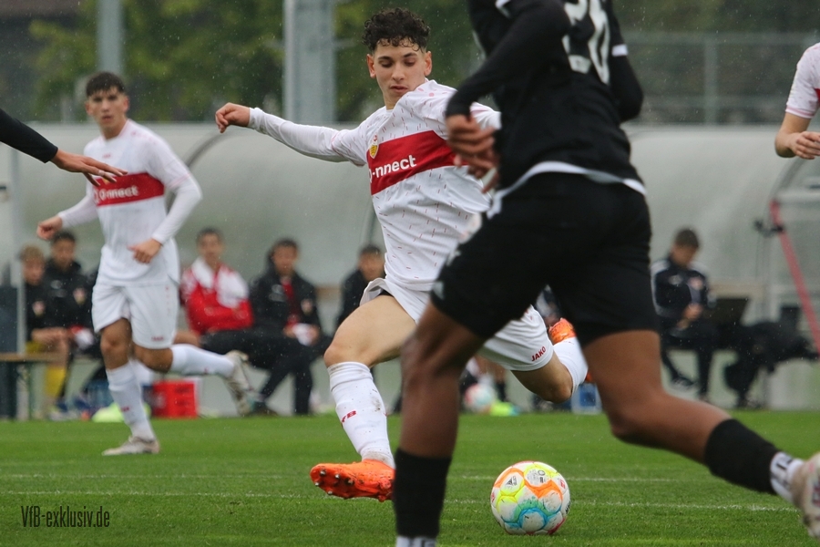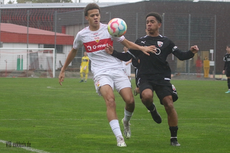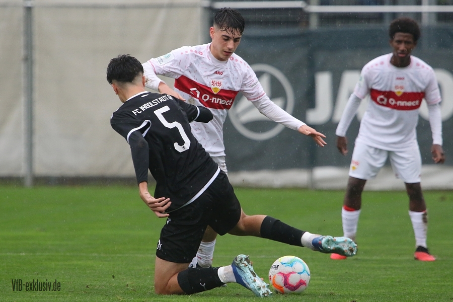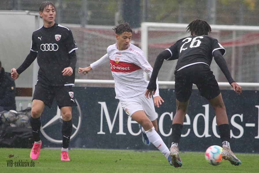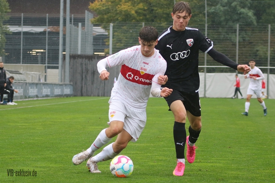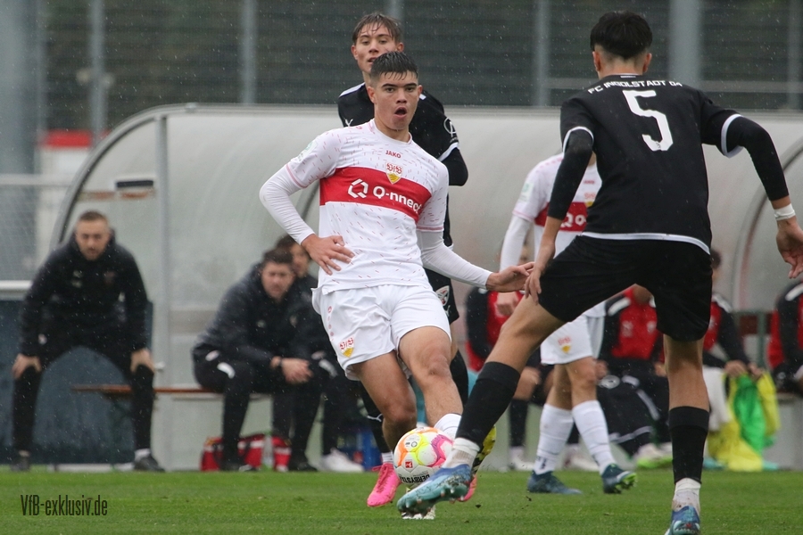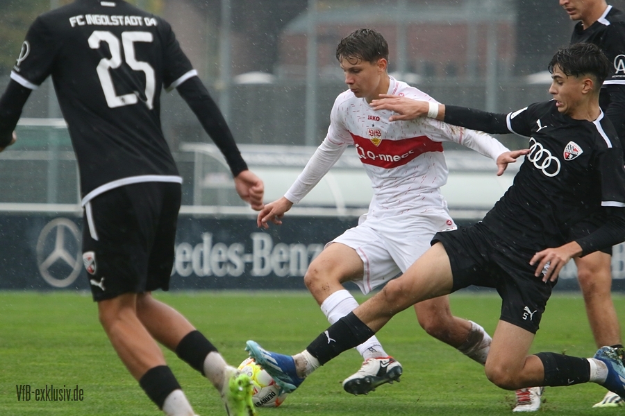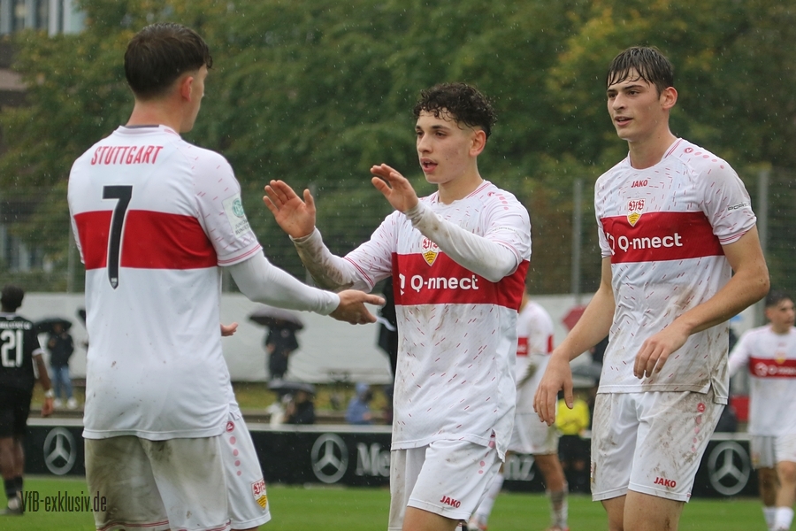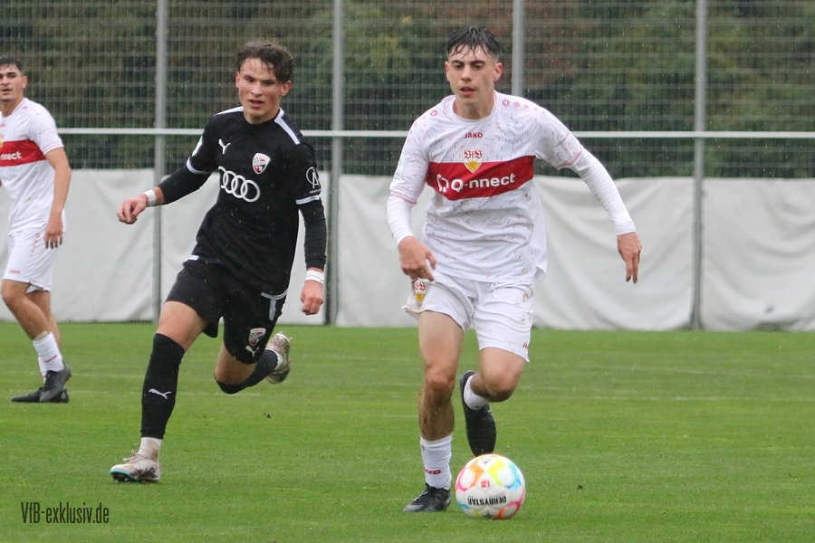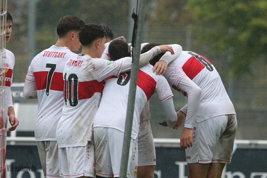 Mit dem FC Ingolstadt war der Tabellenletzte der B-Junioren-Bundesliga zu Gast beim Spitzenreiter VfB. Im Dauerregen von Cannstatt zeigte die Elf von Jan Kirchhoff von Beginn an wer am Ende das Spiel gewinnen will und wird. Ein früher Elfmeter für Stuttgart brachte die Schwaben durch Matheos Tsigkas in Führung. Es entwickelte sich ein Spiel auf ein Tor mit einigen guten Tormöglichkeiten, die erstmal ungenutzt blieben. Fünf Minuten vor der Pause, konnte Tuncay Durna eine Flanke per Kopf verwerten. Nach dem Seitenwechsel das gleiche Bild. Keeper Florian Hellstern erlebte einen ruhigen Nachmittag. Mirza Catovic schraubte das Ergebnis per Abstauber auf 3:0. Die Schwaben ließen nicht locker, Ingolstadt stand in der Defensive ordentlich, doch es war erneut Tuncay Durna, der aus spitzem Winkel zum 4:0 traf. Ein zweiter Doppeltorschütze hieß Mirza Catovic. Nach einer Ecke köpfte er zum 5:0-Endstand ein. Danach war direkt Schluss. Der VfB hat nach elf Spieltagen, neun Siege und zwei Remis auf dem Konto und führt die Tabelle mit vier Punkten Vorsprung vor Nürnberg an.