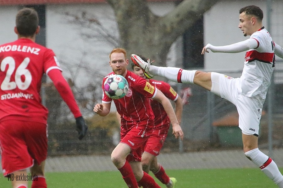 Spielpraxis sammeln und den kleinen Roten gleichzeitig dabei helfen, das war das Motto für Lilian Egloff, Philipp Klement und Wahid Faghir am Samstagnachmittag beim Spiel der U21 gegen Rot-Weiss Koblenz. Beide Ziele wurden erreicht. Der VfB erwischte einen Start nach Maß. Bereits nach drei Minuten traf der VfB-Profi Philipp Klement zur 1:0-Führung. Der VfB konnte in der Folge weitere Akzente setzen. Das Wetter allerdings wurde von Minute zu Minute ungemütlicher. Nach rund 25 Minuten unterbrach der Schiedsrichter die Partie für zehn Minuten. Ein heftiger Graupelschauer zog über das VfB-Vereinsgelände. Nach Wiederanpfiff ging es in leichten Schneefall über, das störte den dänischen U21-Nationalspieler Wahid Faghir wenig. Er umkurvte zwei, drei Gegenspieler und traf zum 2:0. Er stellte damit, wie schon in der Bundesliga gegen Union Berlin, seine Knipserfähigkeiten unter Beweis und dass er für Tore nur wenige Möglichkeiten braucht. Wenig Möglichkeiten wäre dann auch bereits die Überschrift für den zweiten Durchgang. Der Schnee von oben hatte sich verzogen, es spielte aber hauptsächlich nur noch Koblenz. Die Defensive der Schwaben stand allerdings gut, so dass wenig zwingende Möglichkeiten für Rot-Weiss dabei heraussprangen. Frank Fahrenhorst war nach dem Match zufrieden, endlich wieder dreifach gepunktet zu haben und damit hoffentlich wieder ein Stück mehr Selbstvertrauen für die noch anstehenden Partien vor der Winterpause getankt zu haben.