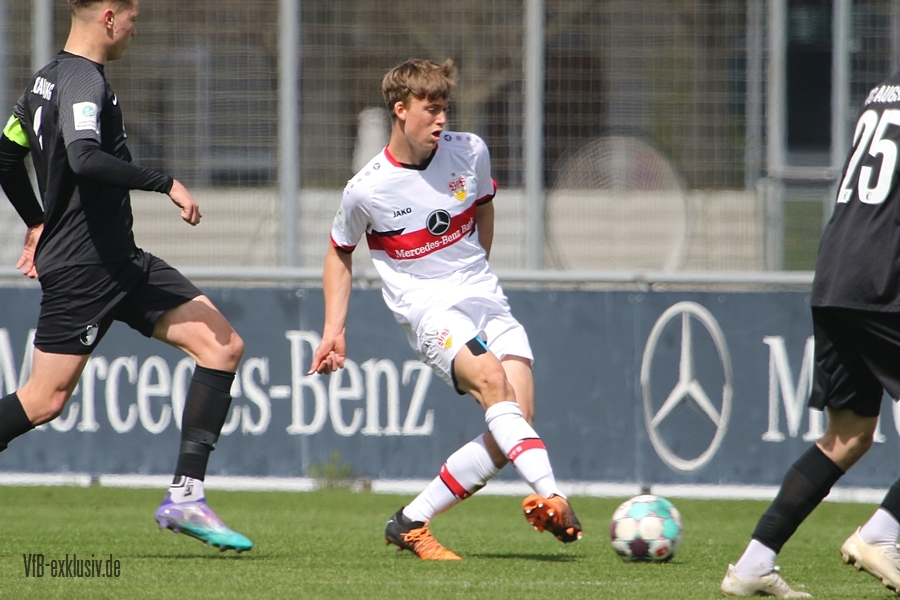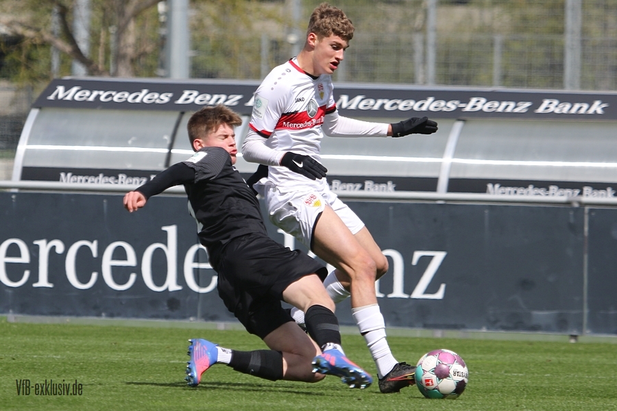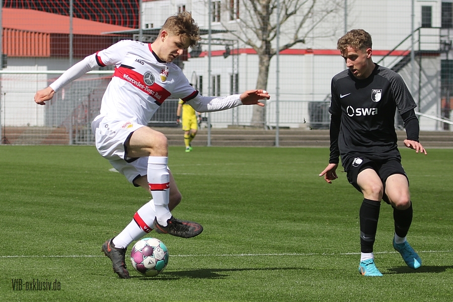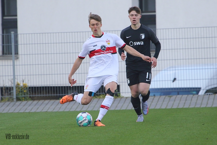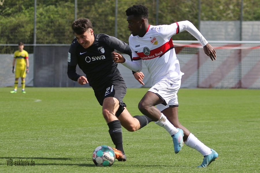 Die Sektflaschen standen wahrscheinlich schon kühl im Nachwuchsleistungszentrum an der Mercedesstrasse. Der U17 war die Staffelmeisterschaft mit einem Sieg über Augsburg nicht mehr zu nehmen. In der ersten Hälfte war der VfB die klar bessere Mannschaft, sie erarbeiteten sich Feldvorteile und hatten auch Chancen in Führung zu gehen. Benjamin Boakye reckte die Faust schließlich in den Cannstatter Himmel, als er nach Vorarbeit von Laurin Ulrich, zum 1:0 traf. Augsburg hatte nur eine Chance, die Torhüter Dennis Seimen entschärfen konnte. Mit Beginn des zweiten Durchgangs kamen die Gäste ein wenig besser ins Spiel. Der VfB hatte allerdings noch immer die gefährlicheren Szenen vor dem Tor. Nach einem Foulelfmeter, gab es die große Möglichkeit, eine Vorentscheidung zugunsten der Cannstatter zu erzielen. Luca Reimunds Schuss war allerdings zu schwach und kein Problem für den Keeper des FCA. Wie es meist so kommt, wenn man die besten Chancen liegen lässt, es wird bestraft. Augsburg drängte in den letzten Spielminuten zum Ausgleich. Und sie schafften es. Die Ersatzspieler des VfB standen bereits zum Jubeln an der Seitenlinie, am Ende hingen die Köpfe zu Boden. Dennoch, der eine Punkt reicht praktisch zum Staffelmeistertitel, denn der Verfolger Unterhaching hat nur noch ein Spiel zu bestreiten und drei Punkte Rückstand. Stuttgart hat das um 27 Tore bessere Torverhältnis. Die Wahrscheinlich geht gegen Null, das noch zu verspielen. In der kommenden Woche kann man es bei den Kickers auf der Waldau endgültig den Deckel drauf machen.