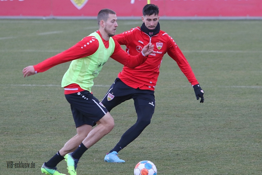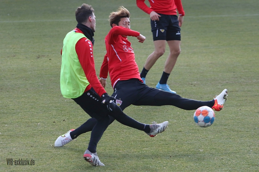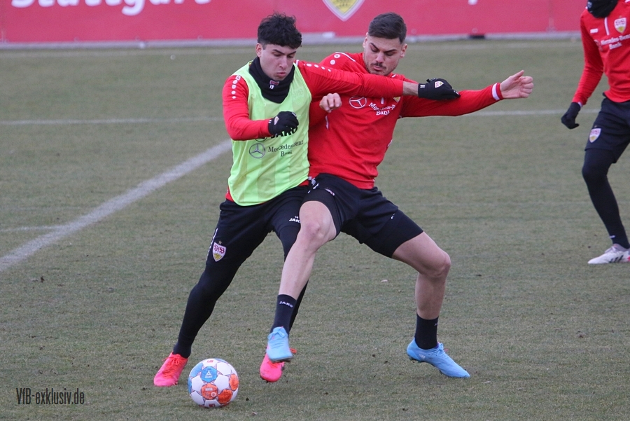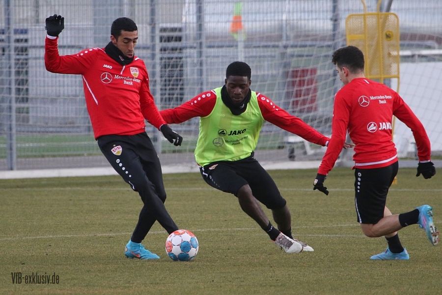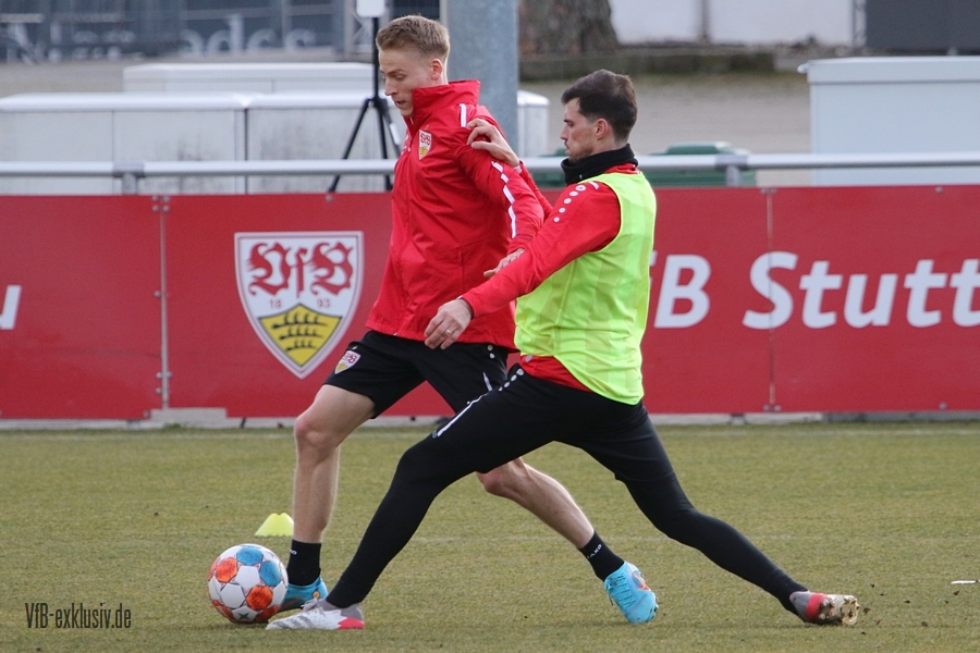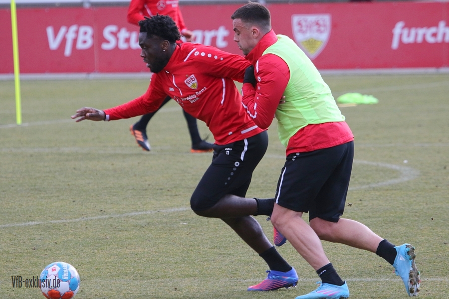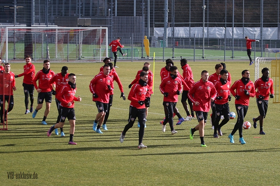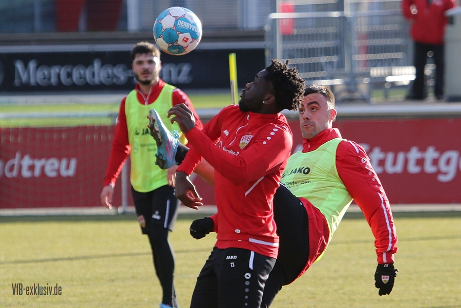 Zwei freie Tage waren für die Akteure des VfB drin, ehe es am Dienstag wieder auf den Rasen ging. Bochum wartet im Heimspiel am Samstag auf den VfB, die die Bayern regelrecht aus dem Stadion geschossen hatten. Als einer der ersten Spieler kam Waldemar Anton aus der Kabine. Er konnte nach seinem positiven Corona-Befund wieder mitwirken und war sofort über die volle Distanz in allen Übungen am Ball. Von Omar Marmoush, der sich ebenfalls das Coronavirus einfing, war noch nichts zu sehen. Für Sasa Kalajdzic reichte es mit seinen Wadenproblemen auch noch nicht fürs Mannschaftstraining, er absolvierte ein individuelles Training im Kraftraum. Tanguy Coulibaly und Daniel Didavi liefen nach dem gemeinsamen Warm-Up ihre Runden, vormutlich Trainingssteuerung. Der Rest des Teams teilte sich in zwei Gruppen auf die beiden Hälften des Trainingsplatzes auf. Es ging darum, mit einem langen Ball aus der Abwehrreihe über die Flügel oder durch die Mitte ins Angriffsspiel zu gelangen. Das Mittelfeld sollte dabei schnell überbrückt werden, um so zum Torabschluss zu kommen. Die Stürmer mussten sich gegen eine massive Abwehrreihe durchsetzen. Auch der nächste Gegner Bochum, wird vermutlich nicht unbedingt das Spiel machen wollen, sondern aus einer kompakten Defensive agieren.
