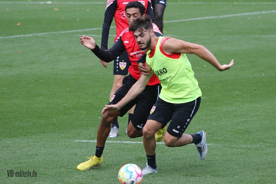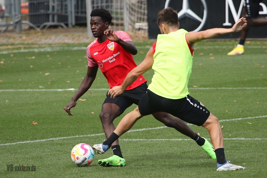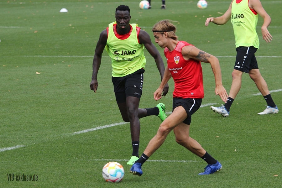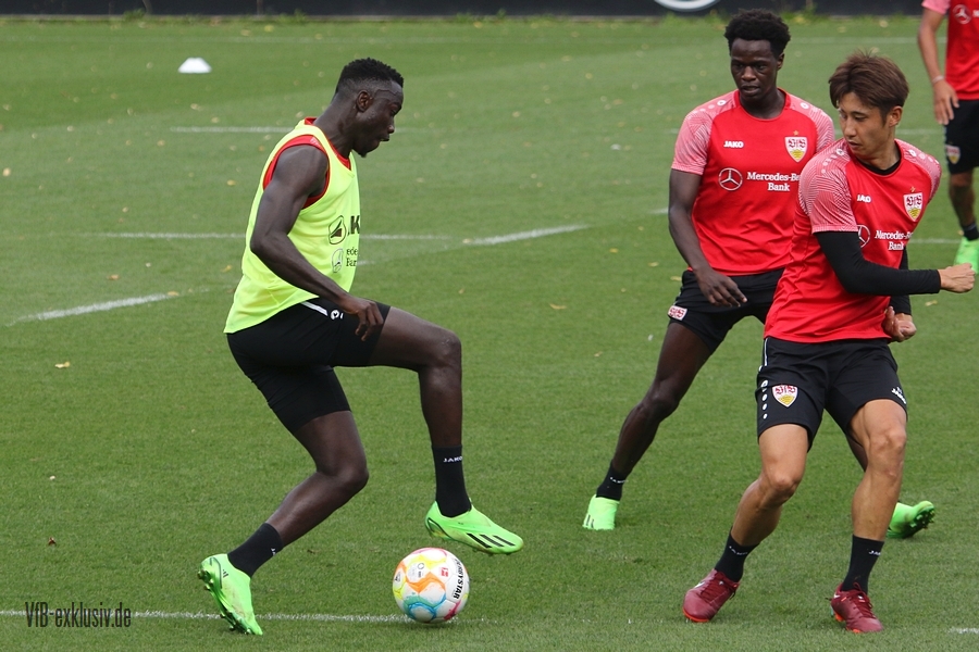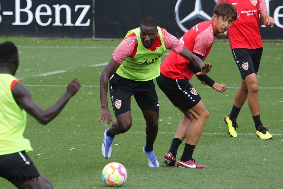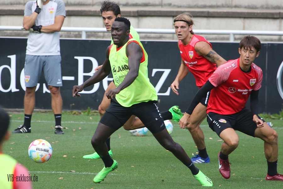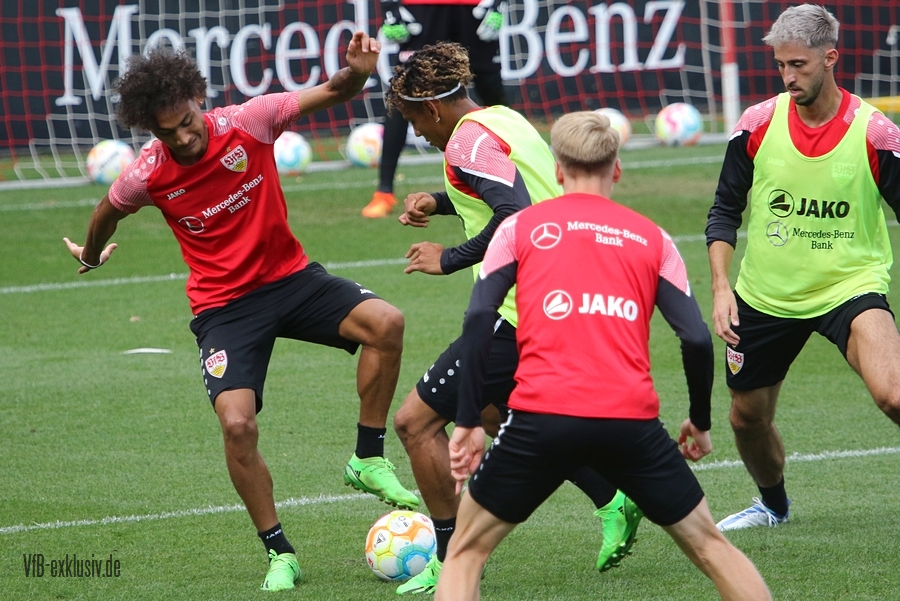 Im Abschlusstraining am Freitagnachmittag ließ sich Pellegrino Matarazzo nicht in die Karten schauen. Nach Passübungen, ging es für rund 15 Minuten ins Abschlussspiel. Dabei standen sich jeweils zehn Mann pro Team gegenüber. Böse Zungen könnten jetzt behaupten, der VfB trainiert nach zwei Platzverweisen in den letzten beiden zurückliegenden Spielen, wie man am besten zu Zehnt ein Spiel bestreitet. Es war am Ende einfach der Tatsache geschuldet, dass Matarazzo nicht mehr Spieler zur Verfügung standen. Josha Vagnoman, für das Spiel in München gesperrt, war gar nicht auf dem Rasen. Laurin Ulrich und Nikolas Nartey absolvierten eine individuelle Einheit mit Nate Weiss und Tanguy Coulibaly lief einige Runden um den Platz. Alou Kuol war bei der U21 im Abschlusstraining für das morgige Heimspiel gegen FSV Frankfurt. Neben den Keepern Müller und Bredlow standen sich noch 18 Feldspieler gegenüber. In Team gelb war Mavropanos, Karazor, Endo, Egloff, Pfeiffer, Guirassy, Silas, Aidonis und Perea. Das Team ohne Leibchen bildeten die Spieler Stenzel, Anton, Ito, Ahamada, Führich, Tomas, Kastanaras, Sosa und Millot. Eine Startelf ließ aus dieser Konstellation nicht herauslesen. Sollten diese zwangig Spieler den Kader bilden, wird der VfB auf einen Bankplatz verzichten und nur 19 Spieler mitnehmen, denn mit Luca Pfeiffer ist zusammen mit Josha Vagnoman ein zweiter Spieler für die Auswärtsreise gesperrt, der allerdings im Team mit Silas spielte.
