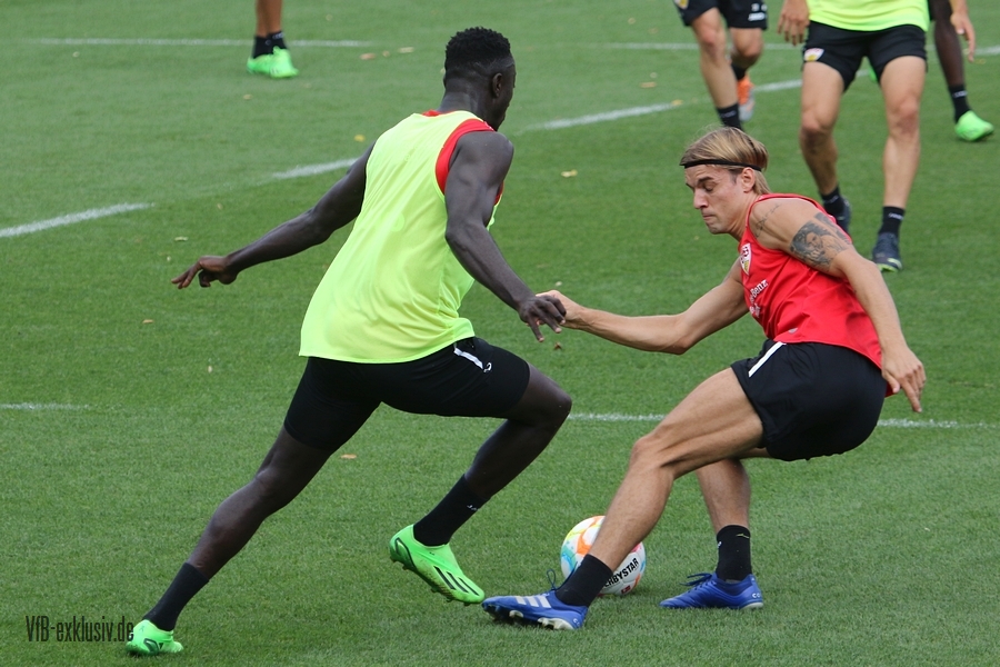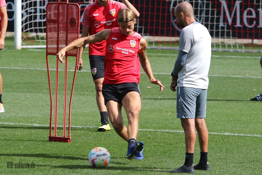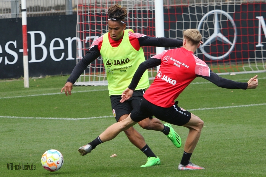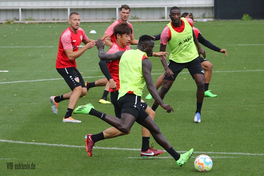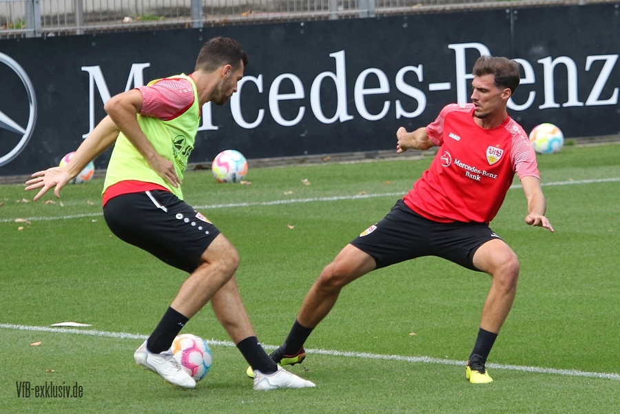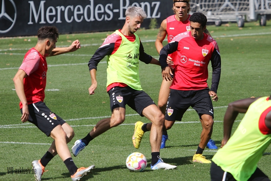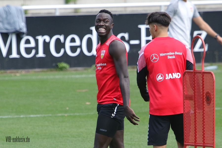 Im Abschlusstraining am Freitagnachmittag ließ sich Pellegrino Matarazzo nicht in die Karten schauen. Nach Passübungen, ging es für rund 15 Minuten ins Abschlussspiel. Dabei standen sich jeweils zehn Mann pro Team gegenüber. Böse Zungen könnten jetzt behaupten, der VfB trainiert nach zwei Platzverweisen in den letzten beiden zurückliegenden Spielen, wie man am besten zu Zehnt ein Spiel bestreitet. Es war am Ende einfach der Tatsache geschuldet, dass Matarazzo nicht mehr Spieler zur Verfügung standen. Josha Vagnoman, für das Spiel in München gesperrt, war gar nicht auf dem Rasen. Laurin Ulrich und Nikolas Nartey absolvierten eine individuelle Einheit mit Nate Weiss und Tanguy Coulibaly lief einige Runden um den Platz. Alou Kuol war bei der U21 im Abschlusstraining für das morgige Heimspiel gegen FSV Frankfurt. Neben den Keepern Müller und Bredlow standen sich noch 18 Feldspieler gegenüber. In Team gelb war Mavropanos, Karazor, Endo, Egloff, Pfeiffer, Guirassy, Silas, Aidonis und Perea. Das Team ohne Leibchen bildeten die Spieler Stenzel, Anton, Ito, Ahamada, Führich, Tomas, Kastanaras, Sosa und Millot. Eine Startelf ließ aus dieser Konstellation nicht herauslesen. Sollten diese zwangig Spieler den Kader bilden, wird der VfB auf einen Bankplatz verzichten und nur 19 Spieler mitnehmen, denn mit Luca Pfeiffer ist zusammen mit Josha Vagnoman ein zweiter Spieler für die Auswärtsreise gesperrt, der allerdings im Team mit Silas spielte.