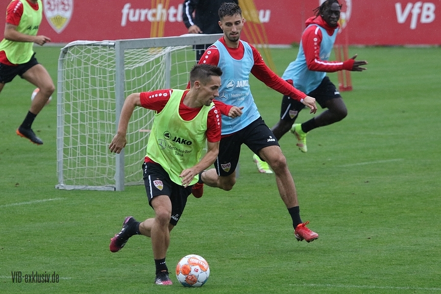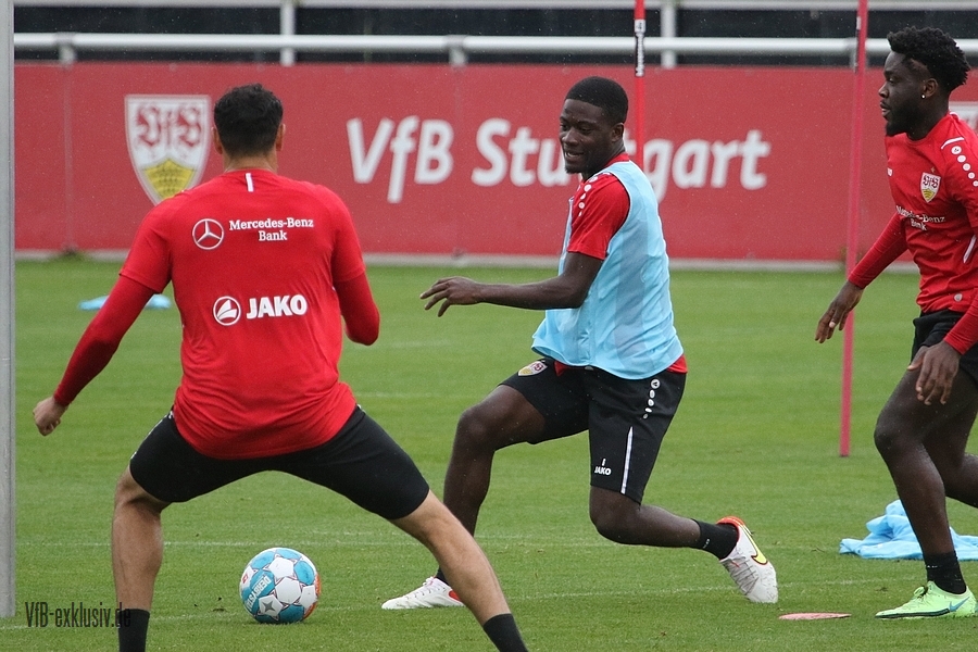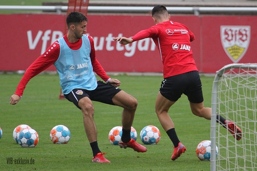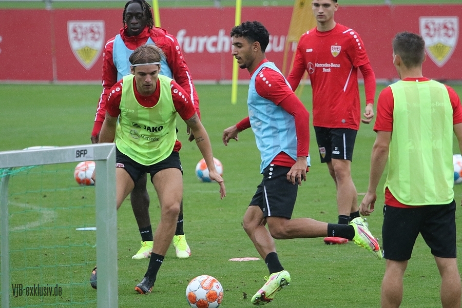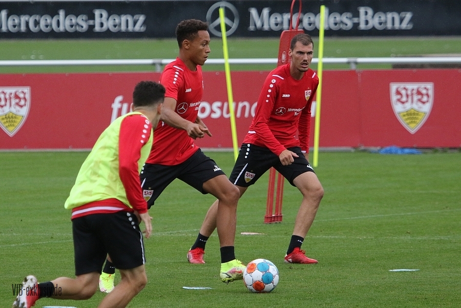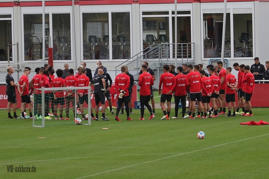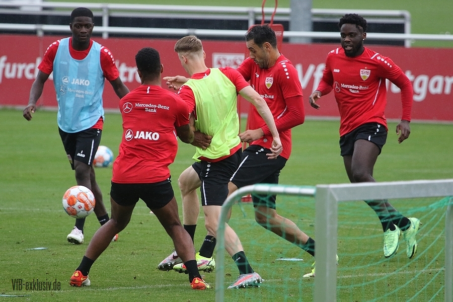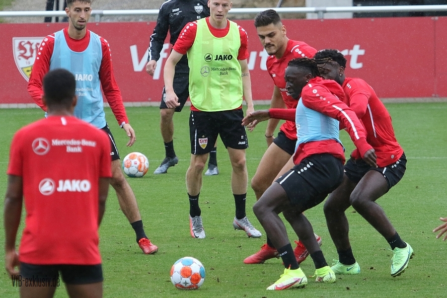 Nach einem Tag Ruhe für den Rasen des Trainingsplatzes und die müden VfB-Beine, ging es am Mittwochvormittag wieder mit der versammelten Truppe in die Vollen. Zu Beginn der Trainingseinheit stellten sich die gewählten Vertreter der Vereinsführung um Präsident Claus Vogt und der Präsidiumsmitglieder Rainer Adrion und Christian Riethmüller sowie die Vorstände der AG in Person von Thomas Hitzlsperger und Dr. Thomas Ignatzi, der Mannschaft vor. Dies war vorher komplett so wohl noch nicht möglich. Zu dem Zeitpunkt war noch in öffentlich, dass Thomas Hitzlsperger seinen bis Oktober 2022 laufenden Vertrag nicht verlängern wird. Sie schauten sich die Trainingseinheit im Anschluss an die kurze Vorstellung noch ein bißchen an, wie es erst in die Krafteinheit mit Bändern ging und in die Passübungen. Die Spielform verlief über das komplette Feld, wobei drei Teams gebildet wurden. Ein Team übte das Angriffsspiel auf ein Tor, die beiden anderen Teams standen sich auf zweidrittel des Feldes gegenüber. Das Ziel der Einheit war eine schnellere und präzisere Überbrückung von der Balleroberung bis zum Torabschluss. Man könnte es auch Konterspiel oder Umschalten nennen. Dabei standen die Gegenspieler in allen Bereichen des kurzen Feldes, um diesen Konter zu unterbinden und um selbst den Torerfolg auf kleine Hockeytore zu erreichen. In der Einheit ging es intensiv zur Sache, drei Akteure fehlten allerdings. Wataru Endo und Waldemar Anton bekamen im Rahmen der Trainingssteuerung frei. Anton wird aufgrund seiner Sperre gegen Leverkusen nicht auflaufen dürfen. Endo hatte kaum Urlaub und war zuletzt erneut mit dem Nationalteam unterwegs. Außerdem fehlte noch immer Philipp Förster, der gegen Frankfurt aufgrund eines Infekts nicht im Kader stand. Naouirou Ahamada absolvierte, wie bereits am Montag, eine individuelle Einheit.