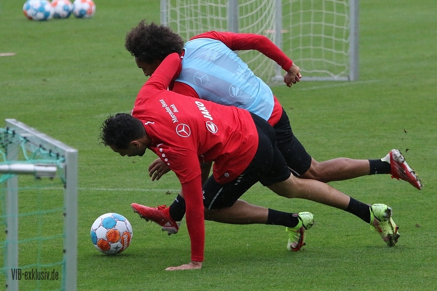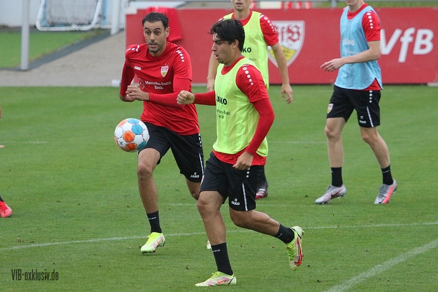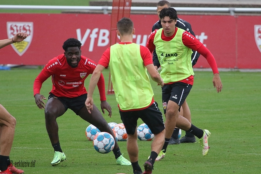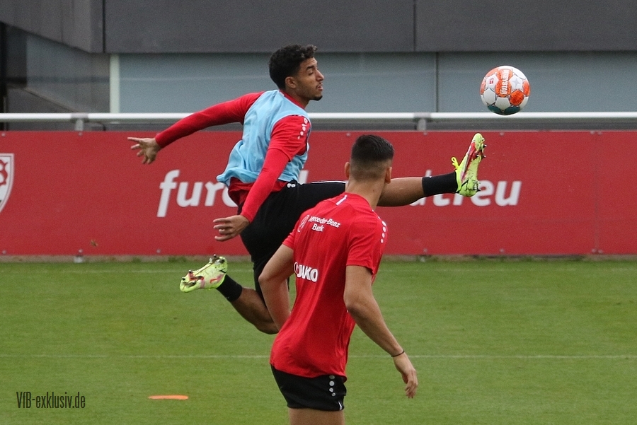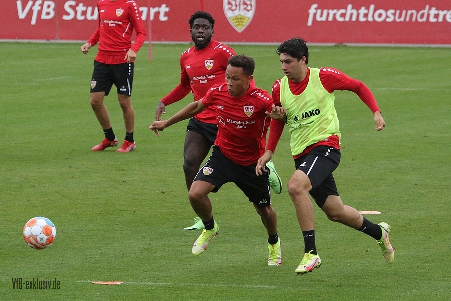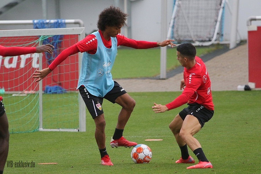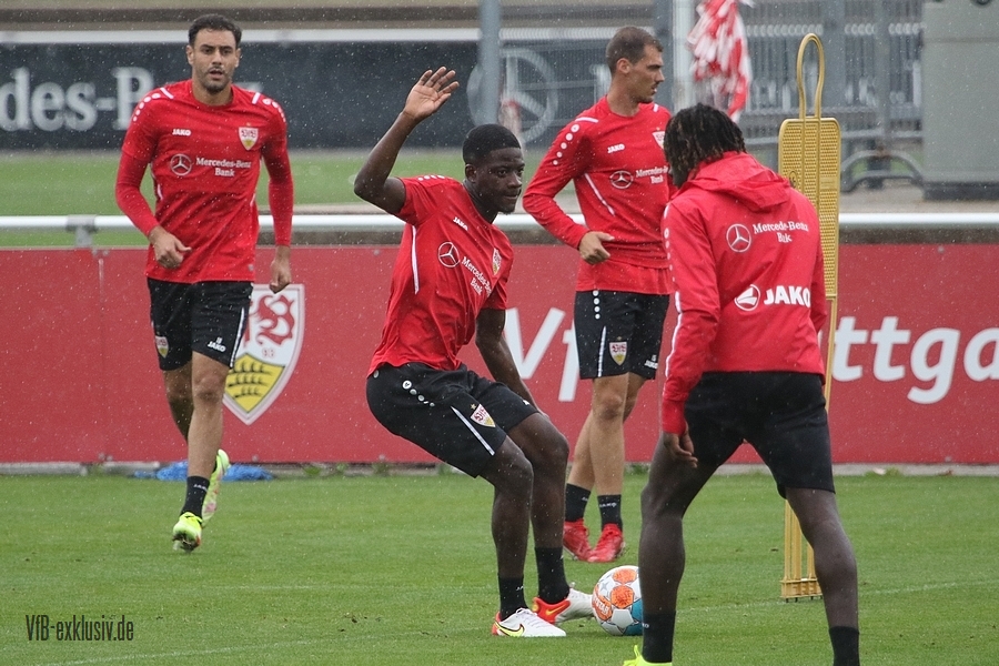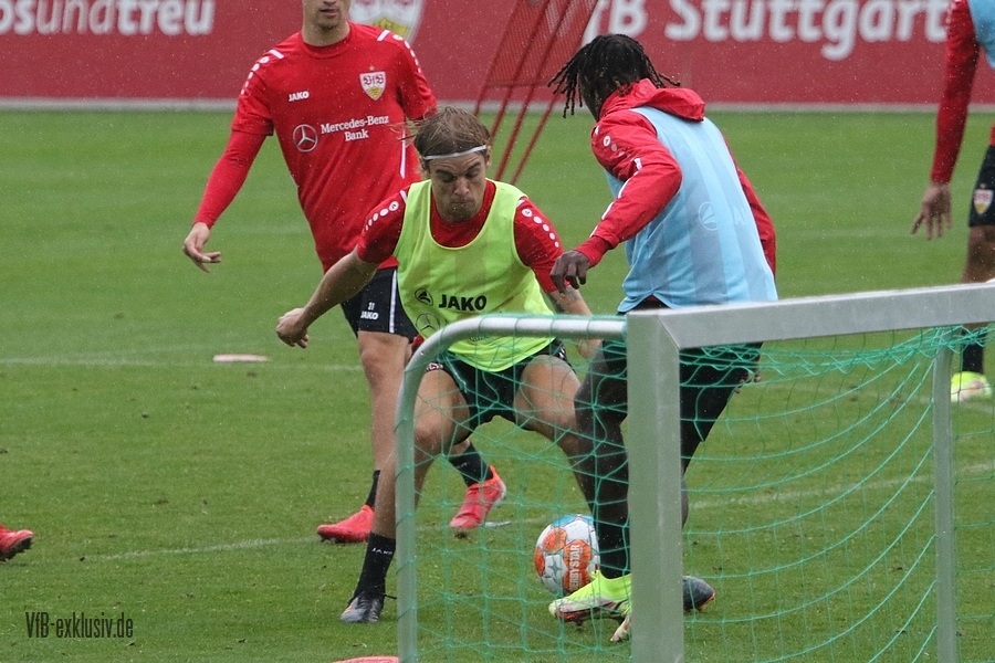 Nach einem Tag Ruhe für den Rasen des Trainingsplatzes und die müden VfB-Beine, ging es am Mittwochvormittag wieder mit der versammelten Truppe in die Vollen. Zu Beginn der Trainingseinheit stellten sich die gewählten Vertreter der Vereinsführung um Präsident Claus Vogt und der Präsidiumsmitglieder Rainer Adrion und Christian Riethmüller sowie die Vorstände der AG in Person von Thomas Hitzlsperger und Dr. Thomas Ignatzi, der Mannschaft vor. Dies war vorher komplett so wohl noch nicht möglich. Zu dem Zeitpunkt war noch in öffentlich, dass Thomas Hitzlsperger seinen bis Oktober 2022 laufenden Vertrag nicht verlängern wird. Sie schauten sich die Trainingseinheit im Anschluss an die kurze Vorstellung noch ein bißchen an, wie es erst in die Krafteinheit mit Bändern ging und in die Passübungen. Die Spielform verlief über das komplette Feld, wobei drei Teams gebildet wurden. Ein Team übte das Angriffsspiel auf ein Tor, die beiden anderen Teams standen sich auf zweidrittel des Feldes gegenüber. Das Ziel der Einheit war eine schnellere und präzisere Überbrückung von der Balleroberung bis zum Torabschluss. Man könnte es auch Konterspiel oder Umschalten nennen. Dabei standen die Gegenspieler in allen Bereichen des kurzen Feldes, um diesen Konter zu unterbinden und um selbst den Torerfolg auf kleine Hockeytore zu erreichen. In der Einheit ging es intensiv zur Sache, drei Akteure fehlten allerdings. Wataru Endo und Waldemar Anton bekamen im Rahmen der Trainingssteuerung frei. Anton wird aufgrund seiner Sperre gegen Leverkusen nicht auflaufen dürfen. Endo hatte kaum Urlaub und war zuletzt erneut mit dem Nationalteam unterwegs. Außerdem fehlte noch immer Philipp Förster, der gegen Frankfurt aufgrund eines Infekts nicht im Kader stand. Naouirou Ahamada absolvierte, wie bereits am Montag, eine individuelle Einheit.
