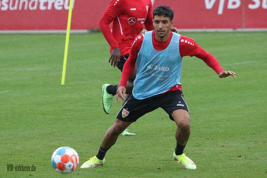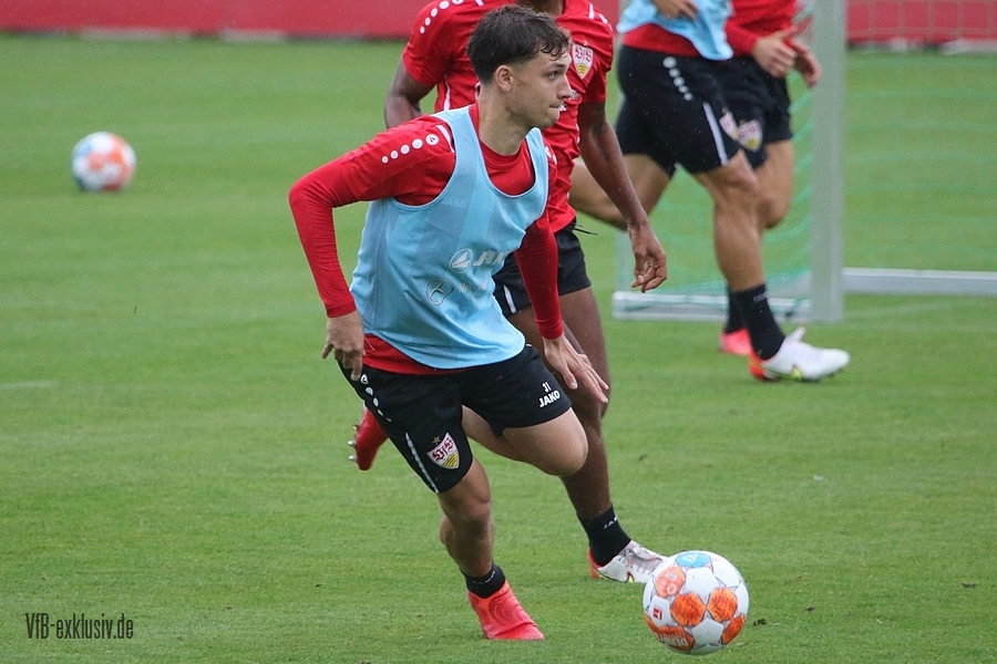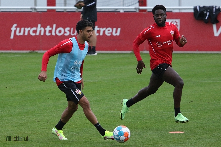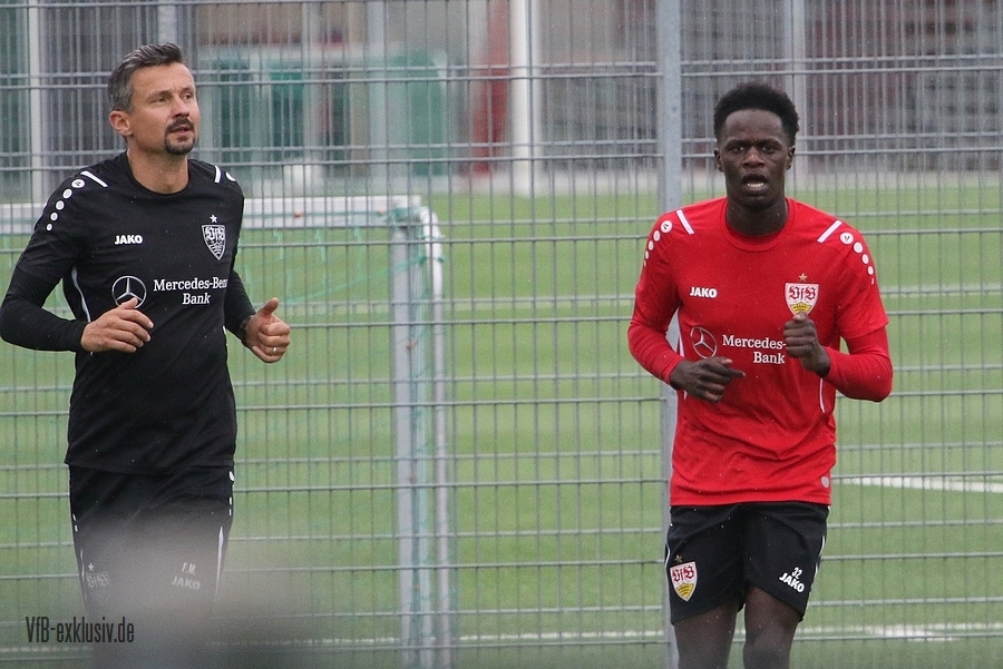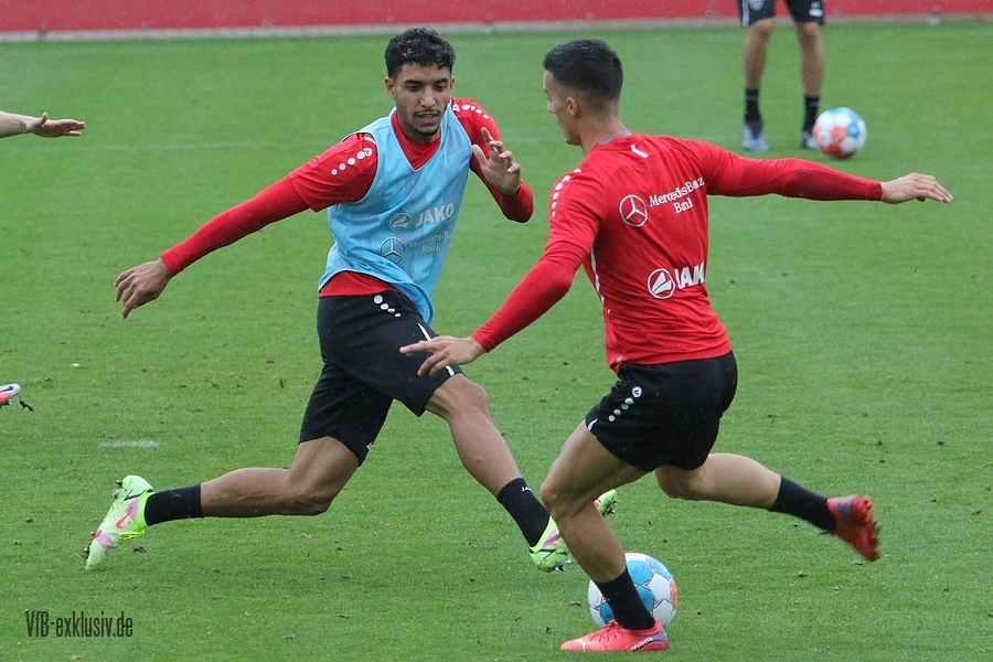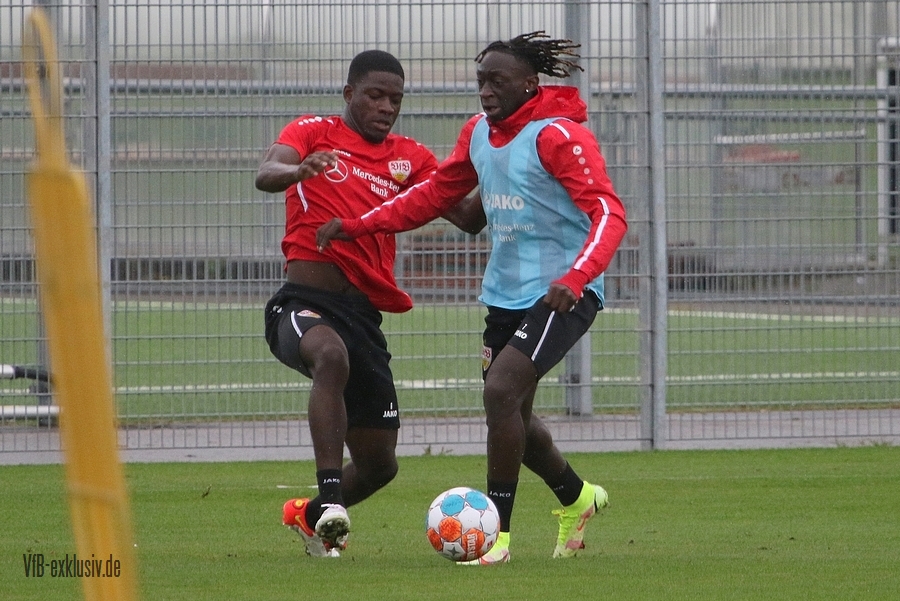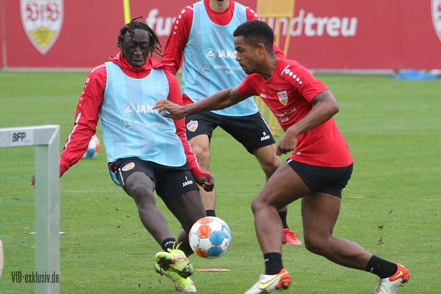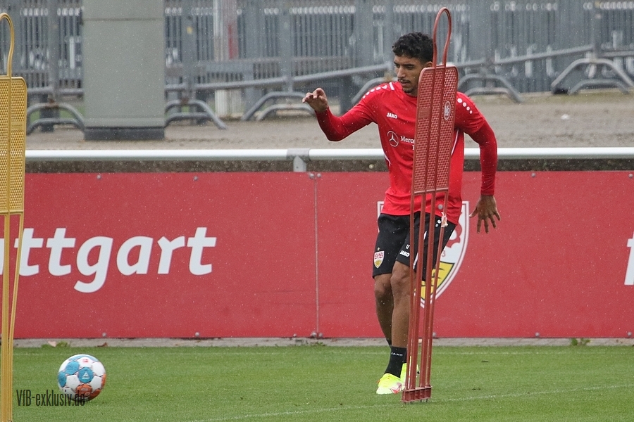 Nach einem Tag Ruhe für den Rasen des Trainingsplatzes und die müden VfB-Beine, ging es am Mittwochvormittag wieder mit der versammelten Truppe in die Vollen. Zu Beginn der Trainingseinheit stellten sich die gewählten Vertreter der Vereinsführung um Präsident Claus Vogt und der Präsidiumsmitglieder Rainer Adrion und Christian Riethmüller sowie die Vorstände der AG in Person von Thomas Hitzlsperger und Dr. Thomas Ignatzi, der Mannschaft vor. Dies war vorher komplett so wohl noch nicht möglich. Zu dem Zeitpunkt war noch in öffentlich, dass Thomas Hitzlsperger seinen bis Oktober 2022 laufenden Vertrag nicht verlängern wird. Sie schauten sich die Trainingseinheit im Anschluss an die kurze Vorstellung noch ein bißchen an, wie es erst in die Krafteinheit mit Bändern ging und in die Passübungen. Die Spielform verlief über das komplette Feld, wobei drei Teams gebildet wurden. Ein Team übte das Angriffsspiel auf ein Tor, die beiden anderen Teams standen sich auf zweidrittel des Feldes gegenüber. Das Ziel der Einheit war eine schnellere und präzisere Überbrückung von der Balleroberung bis zum Torabschluss. Man könnte es auch Konterspiel oder Umschalten nennen. Dabei standen die Gegenspieler in allen Bereichen des kurzen Feldes, um diesen Konter zu unterbinden und um selbst den Torerfolg auf kleine Hockeytore zu erreichen. In der Einheit ging es intensiv zur Sache, drei Akteure fehlten allerdings. Wataru Endo und Waldemar Anton bekamen im Rahmen der Trainingssteuerung frei. Anton wird aufgrund seiner Sperre gegen Leverkusen nicht auflaufen dürfen. Endo hatte kaum Urlaub und war zuletzt erneut mit dem Nationalteam unterwegs. Außerdem fehlte noch immer Philipp Förster, der gegen Frankfurt aufgrund eines Infekts nicht im Kader stand. Naouirou Ahamada absolvierte, wie bereits am Montag, eine individuelle Einheit.