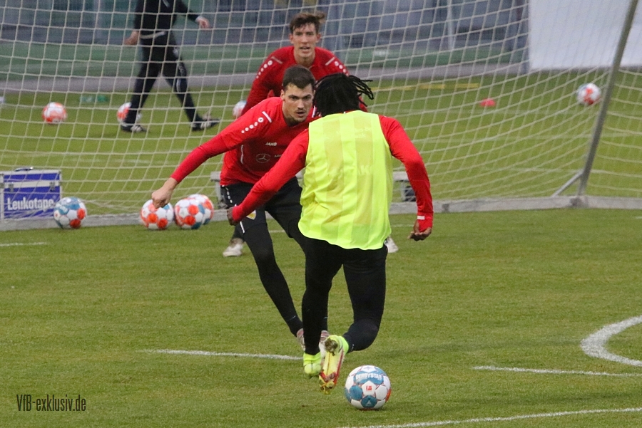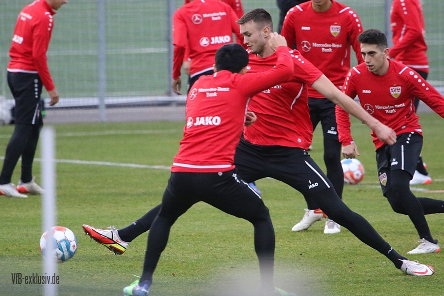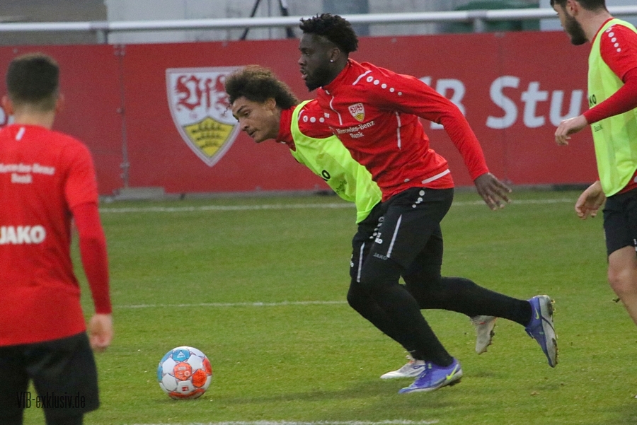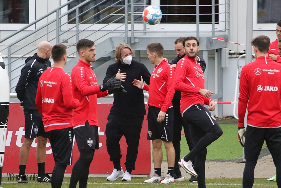 Noch im alten Jahr bat Pellegrino Matarazzo im neuen Look an seinem zweijährigen Dienstjubiläum, sein Team auf den Rasen. Die Rückrunde startet für den VfB am 08. Januar 2022 bei Greuther Fürth. Das Hinspiel konnten die Schwaben fulminant und voller Hoffnung auf die Saison mit 5:1 gewinnen. Ein ähnliches Ergebnis würde dem VfB zum Auftakt ins neue Jahr sicher gut zu Gesicht stehen, doch die Hiobsbotschaften am Wasen reißen nicht ab. Dinos Mavropanos und Mateo Klimowicz wurden schon vor dem Trainingsstart am Donnerstagnachmittag positiv auf das Corona-Virus getestet. Silas Katompa Mvumpa, der seine Papiere in der Heimat für die weitere Aufenthaltserlaubnis organisiert hatte, musste ebenfalls zu Hause bleiben. Bei ihm war ein Schnelltest nicht eindeutig, er muss auf das Ergebnis des PCR-Testes warten. Bis auf den Langzeitverletzten Mo Sankoh und Omar Marmoush, der bei seiner Nationalmannschaft weilt, war der große Rest der Mannschaft beim ersten Training nach der kurzen Winterpause an Bord. Raul Paula und der beste Schütze der U19, Thomas Kastanaras wurden ebenfalls eingeladen am Profitraining teilzunehmen. Nach seiner guten Vorrunde und 15 Tore für das Team von Nico Willig forderten schon viele Fans in den sozialen Netzwerken, dass auch er eine Chance bei den Profis erhalten sollte. Kastanaras machte allerdings bei der Spielform nicht mit, sondern absolvierte den kleinen Fitness- und Kraftzirkel, ehe es in drei Gruppen in die Kurzpassübung ging. Die abschließende Einheit war ein Spiel auf ca. 80 Prozent des Spielfeldes. Das erste Tor nach den Weihnachtsfeiertagen schoss Philipp Förster. Er hatte zuletzt auch in der Bundesliga an zwei aufeinanderfolgenden Spielen einen Treffer markieren können. Die Frage, die sich die Anhänger der Schwaben stellen ist, wer soll den VfB aus dem Tabellekeller schießen? Omar Marmoush wird dem VfB nach aktuellem Stand zu Beginn der Rückrunde nicht zur Verfügung stehen, er spielt mit Ägypten den Afrika-Cup. Sasa Kalajdzic ist voll im Teamtraining, man muss davon ausgehen, dass er in Fürth mindestens auf der Bank sitzen wird. Doch auch die offensiven Außenspieler, wie Roberto Massimo, Tanguy Coulibaly und Borna Sosa sind für Tore gut. Chris Führich und Philipp Förster ebenso. Stuttgart braucht Treffer, um im neuen Jahr zu punkten. Der Start in die Vorbereitung ist getan. Die Spieler werden nur an Neujahr nochmals einen Tag frei haben bis zum Auswärtsspiel beim Tabellenletzten.