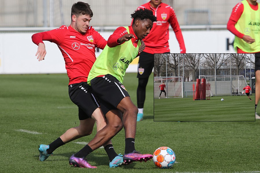 Der VfB startete geteilt in die Trainingswoche am Montagnachmittag. Das Aufwärmprogramm machten alle Spieler mit, die auf dem Rasen waren. Sasa Kalajdzic trainiert indoor individuell, Borna Sosa fehlte ebenfalls noch im Kreis des Teams. Auch Mo Sankoh war nicht auf dem Platz. Während die Startelf vom Samstag im Anschluss ihre Runden um das Trainingsgelände drehte, trainierten die Spieler, die zuletzt nicht so häufig zum Einsatz kamen in der Spielform. Mit dabei und die komplette Einheit am Ball, waren Lilian Egloff und Philipp Förster, die aus unterschiedlichen Gründen (Rückenprobleme und Coronainfektion) zuletzt nicht im Kader standen. Für Egloff wird es erneut ein Aufbau über die U21 werden, für Förster könnte es womöglich wieder in den Kader am Freitag gegen den BVB reichen. Auch Mangala, Coulibaly, Massimo, Tibidi und vor allem Thommy, der nach dem Test gegen Sandhausen, auch im Training wieder richtig Gas gegeben hatte, sorgten für ein gutes Trainingsniveau. Auch wenn Matarazzo seine Startelf seit mehreren Wochen gefunden hat, der ein oder andere Spieler drängt zu mehr Spielminuten. Das kann dem Konkurrenzkampf nur guttun. Eine Umstellung wird der Trainer auf jeden Fall am Freitagabend gegen Dortmund haben. Waldemar Anton muss aufgrund seiner fünften gelben Karte pausieren. Es wird wohl darauf ankommen, ob Borna Sosa bis dahin wieder fit sein wird, um die Frage nach dem Ersatz für Anton beantworten zu können. Pascal Stenzel trainierte mit Fitnesscoach Martin Franz gegen Ende der Einheit mit der Stroboskopbrille. Erik Thommy hingegen baute sich eine 2,20 Meter hohe Wand und übte gegen Keeper Florian Schock nach der Einheit in einer Sonderschicht, die Kunst der direkten Freistöße. Einige gingen daneben, doch den ein oder anderen konnte er, wie Omar Marmoush gegen Augsburg, im Winkel versenken. Die wenigen Trainingsgäste konnten sich am Schluss ihre Unterschrift auf den Trikots abholen.