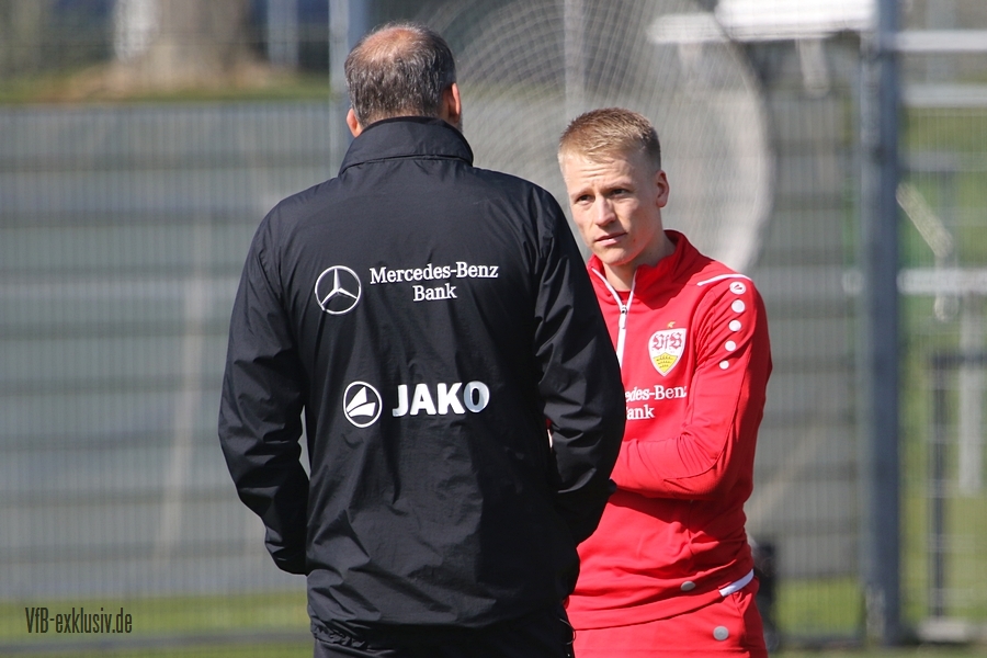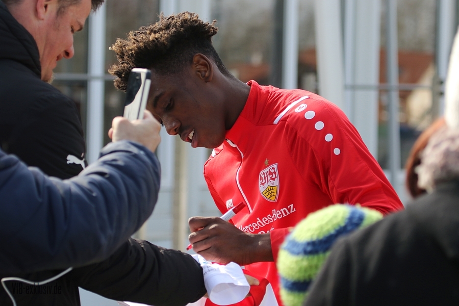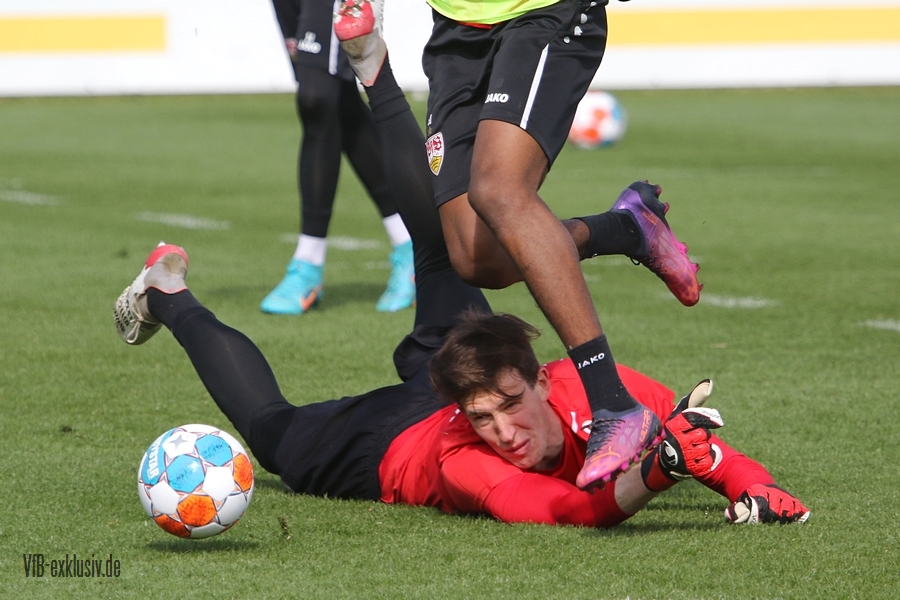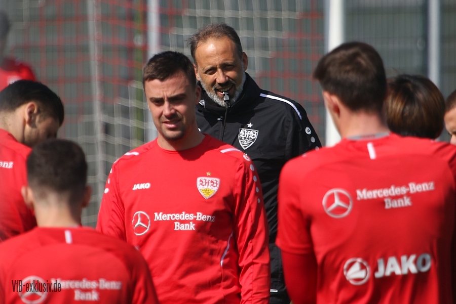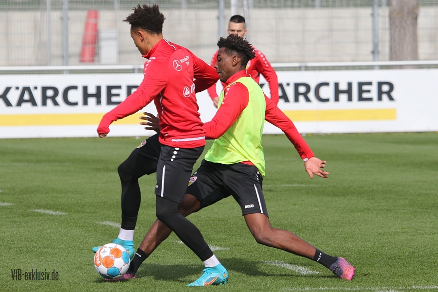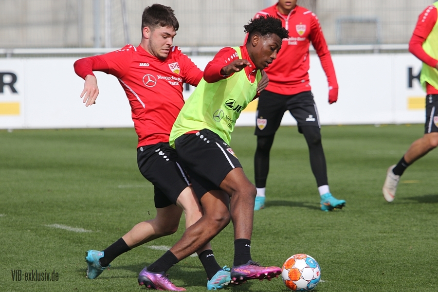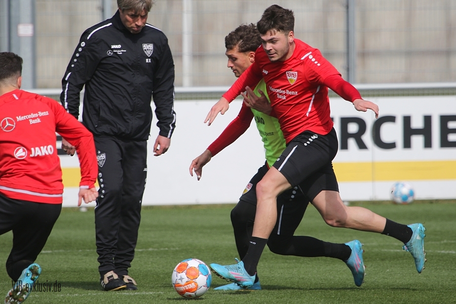 Der VfB startete geteilt in die Trainingswoche am Montagnachmittag. Das Aufwärmprogramm machten alle Spieler mit, die auf dem Rasen waren. Sasa Kalajdzic trainiert indoor individuell, Borna Sosa fehlte ebenfalls noch im Kreis des Teams. Auch Mo Sankoh war nicht auf dem Platz. Während die Startelf vom Samstag im Anschluss ihre Runden um das Trainingsgelände drehte, trainierten die Spieler, die zuletzt nicht so häufig zum Einsatz kamen in der Spielform. Mit dabei und die komplette Einheit am Ball, waren Lilian Egloff und Philipp Förster, die aus unterschiedlichen Gründen (Rückenprobleme und Coronainfektion) zuletzt nicht im Kader standen. Für Egloff wird es erneut ein Aufbau über die U21 werden, für Förster könnte es womöglich wieder in den Kader am Freitag gegen den BVB reichen. Auch Mangala, Coulibaly, Massimo, Tibidi und vor allem Thommy, der nach dem Test gegen Sandhausen, auch im Training wieder richtig Gas gegeben hatte, sorgten für ein gutes Trainingsniveau. Auch wenn Matarazzo seine Startelf seit mehreren Wochen gefunden hat, der ein oder andere Spieler drängt zu mehr Spielminuten. Das kann dem Konkurrenzkampf nur guttun. Eine Umstellung wird der Trainer auf jeden Fall am Freitagabend gegen Dortmund haben. Waldemar Anton muss aufgrund seiner fünften gelben Karte pausieren. Es wird wohl darauf ankommen, ob Borna Sosa bis dahin wieder fit sein wird, um die Frage nach dem Ersatz für Anton beantworten zu können. Pascal Stenzel trainierte mit Fitnesscoach Martin Franz gegen Ende der Einheit mit der Stroboskopbrille. Erik Thommy hingegen baute sich eine 2,20 Meter hohe Wand und übte gegen Keeper Florian Schock nach der Einheit in einer Sonderschicht, die Kunst der direkten Freistöße. Einige gingen daneben, doch den ein oder anderen konnte er, wie Omar Marmoush gegen Augsburg, im Winkel versenken. Die wenigen Trainingsgäste konnten sich am Schluss ihre Unterschrift auf den Trikots abholen.